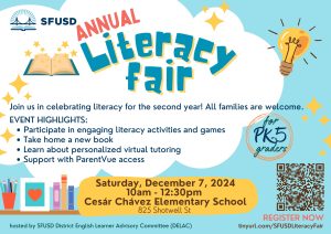 Join SFUSD in celebrating literacy for the second year! All families are welcome. Explore literacy resources and help improve your child’s reading. For PK-5 graders! Event highlights will include: participate in engaging literacy activities and games, take home a new book, learn about personalized virtual tutoring, and support with ParentVue access. Register here!