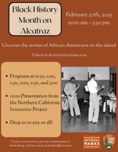Uncover the stories of African Americans on the island. Programs are scheduled for 11:30a, 1p and every half hour until 3pm. Presentation from Northern Innocence Project will be at 12pm. Drop in to any or all of the programs! To register your community group, contact alca_outreach@nps.gov