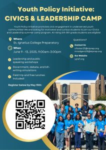 This is a FREE, week-long summer camp for middle schoolers (rising 6th-8th graders). Aspiring campers from underserved backgrounds can learn about public speaking, leadership, and issues facing San Francisco and the country. This year’s Civics and Leadership camp will run from June 9-13, 2025 at St. Ignatius College Preparatory from 9a-3p. All who are eligible are accepted into the program. Register here!
