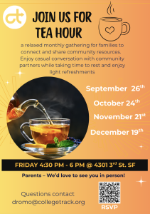 Join College Track for Tea Hour. It’s a relaxed monthly gathering for families to connect and share community resources.