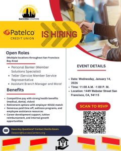 Success Centers has partnered with Patelco Credit Union to host an Employer Spotlight. Come explore the career pathways in the banking industry, while learning about the benefits and growth opportunities. Bring a copy of your resume and ID to apply on-site. RSVP here!