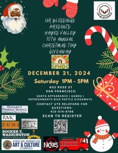 Come out for a free toy during UR Blessings’ 10th annual giveaway in Hayes Valley. The Christmas Toy Giveaway will take place at 403 Rose Street, on Saturday, December 21st from 1-5pm. There will also be games, refreshments, a bike raffle, and an appearance by Santa.
