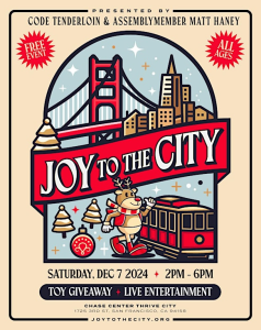 Join Code Tenderloin as they host their 2nd annual Joy to the City holiday celebration with Assemblymember Matt Haney. There will be a toy giveaway (first come, first served), holiday crafts, a book giveaway, live music, face painting, and more! Register early to secure a toy giveaway time slot. The event is free and open to all.