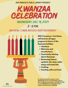 SFPL Promotora, Toni Hines, will lead a program in honor of the Kwanzaa holiday: Libations Welcome and introductions Community-sharing about Kwanzaa Reviewing history, symbols, the days, table setup and materials Crafting Refreshments.