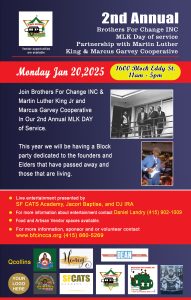Join Brothers for Change and Martin Luther King/Marcus Garvey Cooperative in celebrating the 2nd annual Day of Service at the 1600 block of Eddy Street on Monday, January 20th from 11a-5p. This year, we will be having a block party dedicated to the founders and Elders that have passed away and those who are living. Live entertainment provided by SF CATS Academy, Jacori Baptise, and DJ IRA.