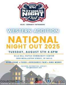 Join us for a family-friendly night of fun! The annual Bayview and Western Addition National Night Out will be on Tuesday, August 5th, from 4 PM to 6 PM, and aims to strengthen community ties with law enforcement. This year, the event will be held at two locations in the Bayview District (Ruth Williams Bayview Opera House and Joseph Lee Recreation Center) and one in the Fillmore District (Ella Hill Hutch Community Center). Attendees can enjoy family resources, a Kid Zone, free food and drinks, live music, interactive exhibits from public safety agencies, local vendor showcases, and raffles.