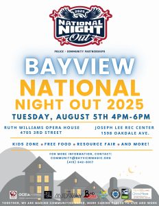 Join us for a family-friendly night of fun! The annual Bayview and Western Addition National Night Out will be on Tuesday, August 5th, from 4 PM to 6 PM, and aims to strengthen community ties with law enforcement. This year, the event will be held at two locations in the Bayview District (Ruth Williams Bayview Opera House and Joseph Lee Recreation Center) and one in the Fillmore District (Ella Hill Hutch Community Center). Attendees can enjoy family resources, a Kid Zone, free food and drinks, live music, interactive exhibits from public safety agencies, local vendor showcases, and raffles.