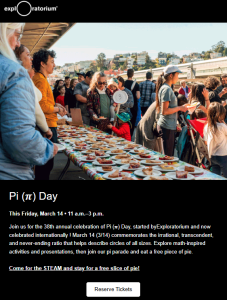 Join the 38th annual celebration of our own homegrown holiday! March 14 (3.14) commemorates the irrational, transcendent, and never-ending ratio that helps describe circles of all sizes. Explore math-inspired activities and presentations, then join our pi parade and eat a free piece of pie. Come for the STEAM and stay for the slice! To purchase tickets, visit https://www.exploratorium.edu/visit/calendar/pi-p-day