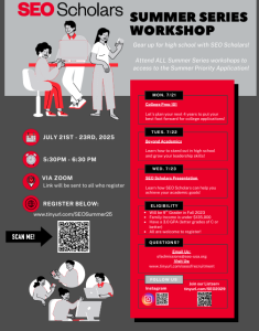 Join the SEO Scholars Summer Series. This is a Virtual Summer Series. Starting on Monday, July 21st to Wednesday, July 23rd, from 5:30pm to 6:39pm.