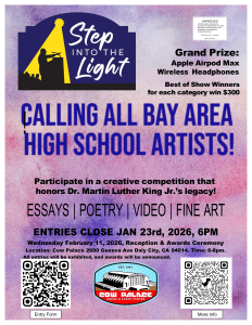 Calling all bay area high school artists! The Cow Palace is hosting a creative competition to celebrate the birthday of Dr. King with a focus on “speaking out” and encouraging youth to share their voice respectfully and effectively. All entries will be on display to the public on Wednesday, February 11th from 6-8pm. Prizes include $300 for best of show and Apple Airpods for the overall winner. Official rules and entry information can be found here. Art and Photography should be submitted in person. Literary and fine arts submissions can be entered on this Google Form.