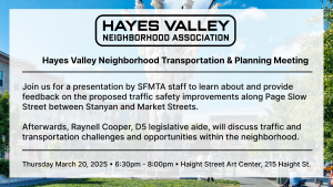 Join HVNA for a presentation by SFMTA staff to learn about and provide feedback on the proposed traffic safety improvements along Page Slow Street between Stanyan and Market Streets. Afterwards, Raynell Cooper, D5 legislative aide, will discuss traffic and transportation challenges and opportunities within the neighborhood. RSVP here!