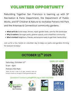 Join us for a fun, hands on volunteer day to keep our parks and gardens thriving for everyone to enjoy! Tasks include: building steps, fences, repairing garden beds, how to care for the landscape, and more. While the day is open to all ages, carpentry tasks are limited to those over the age of 16 with guardian approval. Sign up here!