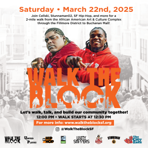 Join Cellski, Stunnaman02, SF Hip-Hop, and more for a 2 mile walk from the African American Arts and Culture Complex through the historic Fillmore District and back to the Buchanan Mall. Let’s walk, talk, and build community together. Visit https://sfhiphop.org/walktheblock for more information; RSVP on Eventbrite