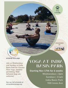 Join Armando Luna Yoga on Wednesdays and Sundays at India Basin Park for Vinyasa Flow Yoga, weather permitting. Come to the park for FREE yoga classes hosted by local studio, Armando Luna.